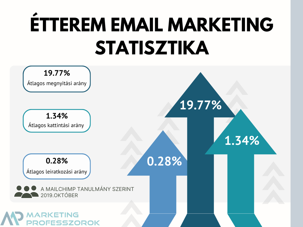A Mailchimp tanulmánya szerint az éttermi emailek átlagos megnyitási aránya 19,77%, az átlagos kattintási arány 1,34%, az átlagos leiratkozási arány pedig 0,28% volt - ezzel kapsz egy képet arról, milyen számokra kell törekedni.Étterem email marketing a több vendég eléréséért